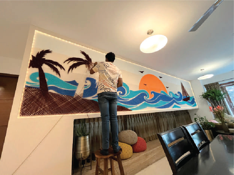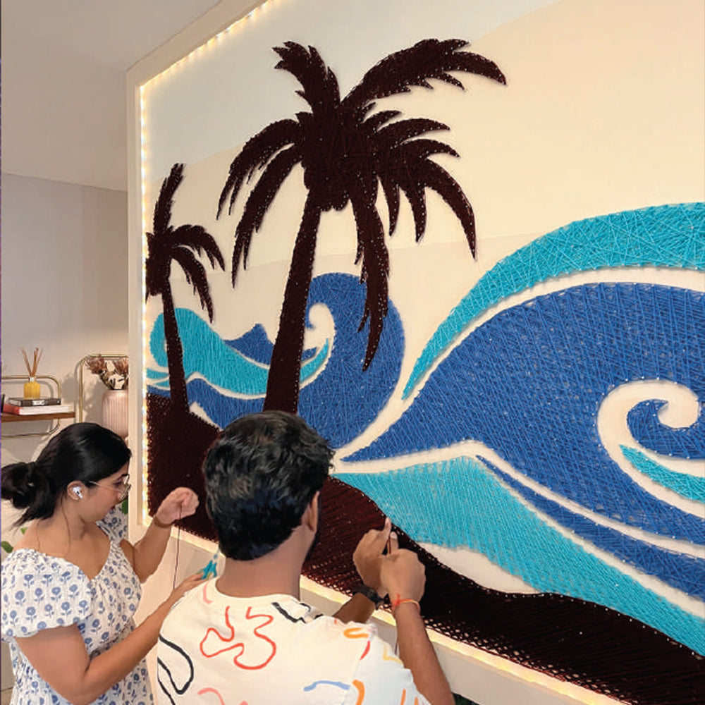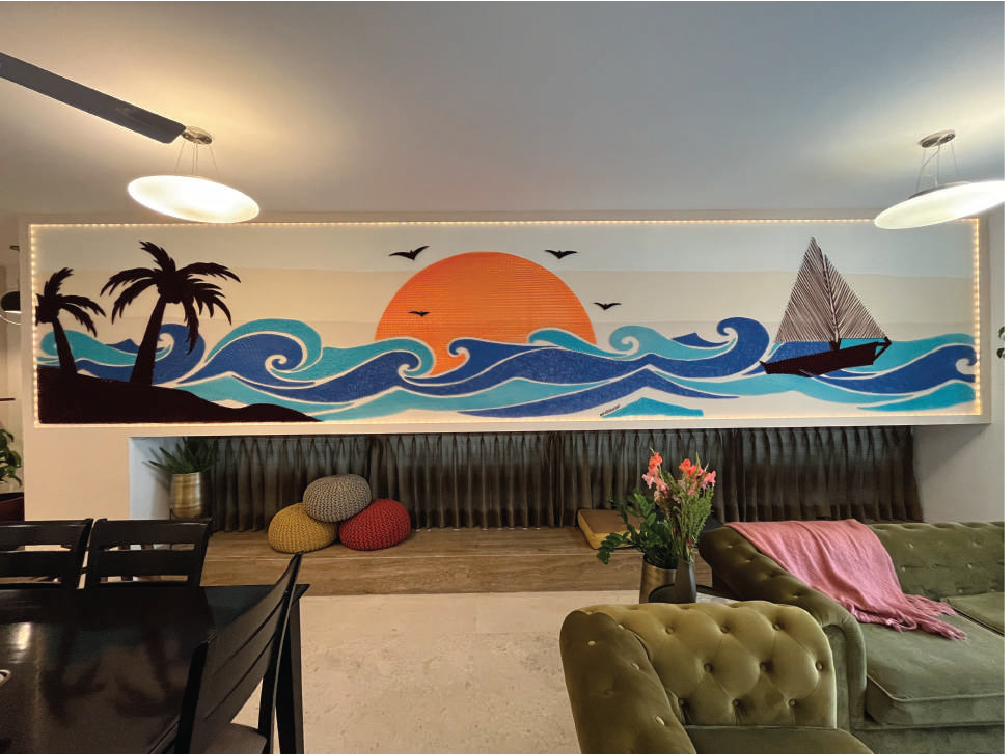 The founder of an upcoming startup wanted his space to speak his feelings, the open-hearted traveller. First of its kind stringart was done in his living room. Waves, sun and the beach are made in a minimal and artistic way to achieve beauty without making the design heavy. (LOCATION: VDB CARDINAL, INDRANAGAR, BANGALORE)
